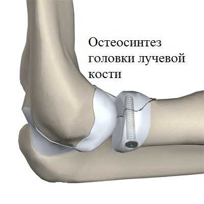 Остеосинтез головки лучевой кости выполняется под общей анестезией. В полость локтевого сустава вводится артроскоп, сустав отмывается от крови, выполняется удаление поврежденных мягких тканей. После достижения хорошего обзора области перелома головки лучевой кости под артроскопическим контролем выполняется анатомичная репозиция костных фрагментов. Фрагменты фиксируются спицами, производится рентген-контроль в операционной. С помощью рентгена подтверждается правильность положения спиц, в то же время артроскопически мы можем с точностью до миллиметра восстановить суставную поверхность головки лучевой кости. По спицам проводятся специальные винты Барука или Герберта требуемого размера. Спицы удаляются.