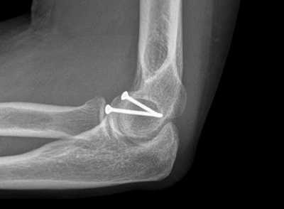 После репозиции, сопоставления костных отломков венечного отростка, с помощью специального направителя в область перелома вводится спица. Положение спицы контролируется рентгеном. В том случае, если положение спицы и перелома удовлетворительное, через разрез в 5-7 мм по спице проводится винт. Полученные в нашей клинике результаты лечения переломов венечного отростка подобным малоинвазивным способом оказались очень обнадеживающими. После операции локтевой сустав фиксируется ортезом на 2 недели. Пациенту разрешается постепенная разработка движений в суставе.