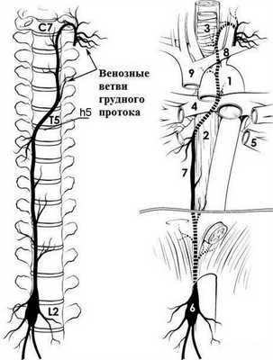 Самым крупным и основным лимфатическим сосудом организма человека является грудной проток (см. рисунок) Рисунок 1. Анатомия и синтопия грудного протока. 1 - дуга аорты, 2 - пищевод, 3 - трахея, 4 - правые легочные артерии, 5 - левая нижняя легочная вена, 6 - хилезная цистерна, 7 - грудной проток, 8 - безымянная вена, 9 - верхняя полая вена. [1, 3-5], который формируется в брюшной полости, в забрюшинной клетчатке, на уровне XII грудного - II поясничного позвонков в результате слияния правого и левого поясничных лимфатических стволов. Примерно в 25% наблюдений в начальную часть грудного протока впадает один-три выносящих лимфатических сосуда брыжеечных лимфатических узлов, которые называют кишечными стволами. В грудной проток впадают выносящие лимфатические сосуды изредка встречающихся предпозвоночных, межреберных, а также висцеральных (предаортальных) лимфатических узлов. Длина грудного протока 30-41 см (Д.Л. Жданов). До 40% людей имеют удвоение или утроение грудного протока. Иногда происходит раздвоение грудного протока на две ветви, чаще в верхней половине грудной клетки, где левый грудной проток впадает в венозную систему в типичном месте, а правый впадает в правую подключичную вену [6].