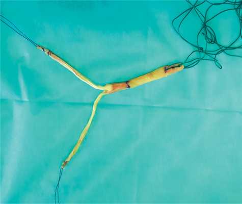 У пациентов 1-й группы BTB-трансплантат дополняли свободным аутотрансплантатом из СПСМ, протянутым через специально сформированное отверстие в трапециевидном костном блоке и предназначенным для ЛЭАТ (рис. 1). Рис. 1. Внешний вид трансплантата для пластики ПКС и ЛЭАТ у пациентов 1-й группы. У них же в наружном мыщелке большеберцовой кости в области бугорка Gerdy формировали дополнительный костный канал диаметром 4 мм, располагая его входное и выходное отверстия на расстоянии не менее 1 см друг от друга.