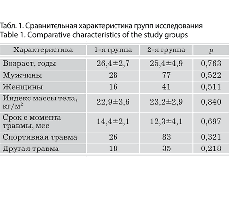 По возрасту и полу пациентов, срокам с момента травмы и ее механизмам группы были сопоставимы (табл. 1). Табл. 1. Сравнительная характеристика групп исследования Возраст, годы Мужчины Женщины Индекс массы тела, кг/м 2 Срок с момента травмы, мес Спортивная травма Другая травма