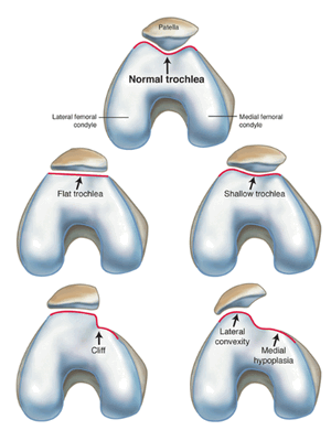 Часто предпосылкой к формированию латеральной нестабильности надколенника становится дисплазия феморопателлярного отдела — врожденного состояния, характеризующегося нарушениями соотношений между надколенником и недостаточно выраженной межмыщелковой бороздой бедренной кости (см. рис.).