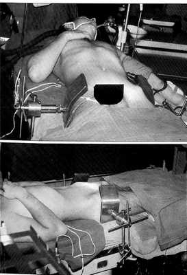 В целях снижения травматичности операций, особенно в случае застарелых повреждений, мы применяли разработанное нами «Устройство для репозиции костей таза» (пат. 2115390 РФ от 18.05.95), предназначенное для обеспечения сжатия костей таза при свежих и застарелых разрывах лобкового симфиза. Устройство крепится непосредственно к операционному столу на стойках (стандартных струбцинах) с обеих сторон таза. Репонирующие элементы регулируются таким образом, чтобы каждая их изогнутая часть прилегала к тазу больного в области тазобедренных суставов. Под наркозом производится сжатие таза в горизонтальной плоскости путем постепенного продольного перемещения сдавливающих пластин посредством винтового механизма. Репозиция контролируется визуально и пальпаторно (рис. 3). При помощи данного устройства нам удавалось полностью устранить или уменьшить диастаз в поврежденном лобковом симфизе даже в сроки до 2 мес после травмы. До начала операции с целью профилактики возможного повреждения мочевого пузыря вводили катетер для пассивного оттока мочи. Для обнажения симфиза мы использовали надсимфизарный поперечный разрез типа Pfannenstiel. Этим путем по внутреннему краю лонного сочленения подходили к фасции и затем к самой кости. Обе прямые мышцы живота отделяли от мест их прикрепления. Сдвигали поднадкостнично до лонных костей приводящие мышцы с обеих сторон. Внутреннюю поверхность лонных костей обходили изогнутым распатором во избежание травматизации венозной сети, которая располагается под костью и позади нее.