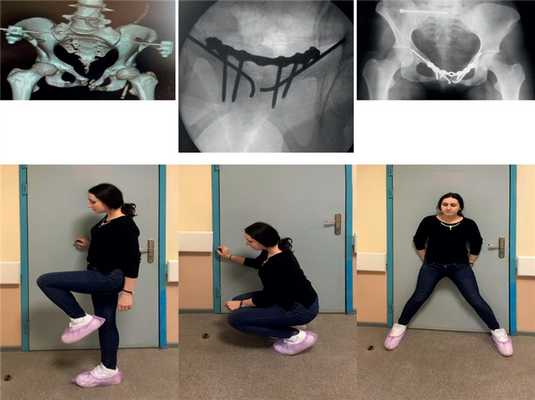 Пациентка Н., 27 лет, получила травму в результате ДТП. Доставлена в отделение через 30 мин. При поступлении: состояние средней тяжести, стабильное, АД 100/60 мм рт.ст., пульс 95 уд/мин, частота дыхательных движений 18 в 1 мин. Был наложен тазовый бандаж, выполнены рентгенография черепа, органов грудной клетки и таза. Выявили двусторонний перелом лонных костей Nakatani II, трансфораминальный перелом крестца справа. Пациентка консультирована хирургом, нейрохирургом; выполнено УЗИ по протоколу EFAST, свободной жидкости не выявлено. В экстренном порядке в операционной наложен АВФ на передний отдел тазового кольца (рис. 3, а). Рис. 3. Пациентка Н., 27 лет, с двусторонним переломом лонных костей Nakatani II, трансфораминальным переломом крестца справа. а — данные КТ после наложения АВФ при поступлении; б — интраоперационная рентгенограмма; в — рентгенограмма через 6 мес после операции; г — функциональный результат через 12 мес после операции.