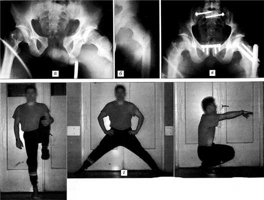 Клинический пример. Больной Н.,35 лет, доставлен в реанимационное отделение института через 12 ч после травмы — падения с высоты 17 м. Диагноз — сочетанная травма: черепно-мозговая травма; нестабильный перелом костей таза типа ВЗ — разрыв лобкового симфиза и обоих крестцово-подвздошных сочленений (рис. 5, а); косой оскольчатый перелом левого бедра (рис. 5, б), перелом правого предплечья, перелом левой пяточной кости, перелом обеих лодыжек левой голени; шок II степени. Через 11 дней, после стабилизации состояния больного, произведены одномоментно восстановление лобкового симфиза тазовой пластиной, обоих крестцово-подвздошных сочленений спонгиозными винтами типа АО и закрытый блокирующий остеосинтез отломков бедренной кости системой PFN (рис. 5, в). Функциональный результат лечения через 8 мес после травмы представлен на рис. 5, г.