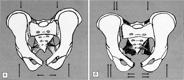 Рис. 1. Повреждения таза по типу «открытой книги»: a — I степени, б — П-Ш степени.