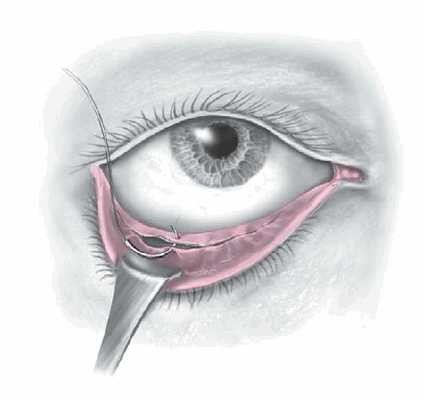Операция может выполняться с применением местного обезболивания либо под общим наркозом. Средняя продолжительность - около часа. Для доступа к конъюнктиве нижнее всего отодвигается специальным крючком, затем хирург делает небольшой разрез, который позволяет ему добраться до окологлазной жировой клетчатки.