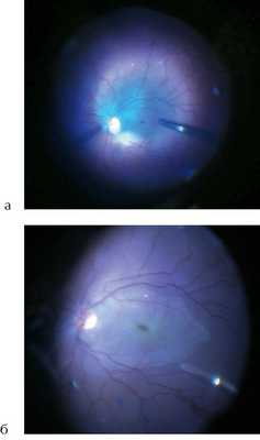 Рис. 1. Интраоперационная фотография глазного дна при проведении витрэктомии. а — при окрашивании внутренней пограничной мембраны ILM Blue краской (DORC); б — после удаления внутренней пограничной мембраны.