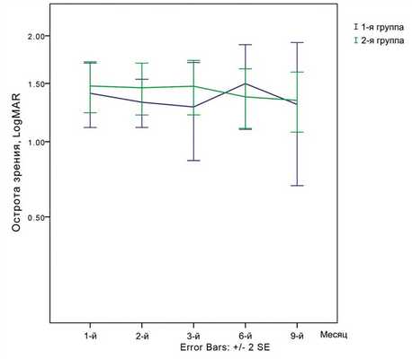 Предоперационная острота зрения в 1-й группе составляла 2,29±0,85 LogMAR, во 2-й — 2,39±0,76 (p=0,485). Окончательная острота зрения в 1-й группе была 1,2±0,5 LogMAR, во 2-й — 1,34±0,82 (p=0,297). В обеих группах наблюдалось улучшение остроты зрения (p<0,001) (рис. 3, 4).