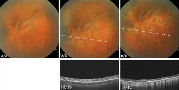 а — множественные клапанные разрывы, слившиеся в один, с локальной отслойкой сетчатки и перекинутым через разрыв сосудом; б — фотография сразу после проведения лазерной ретинопексии; в — фотография через 2 нед после лечения с линией сканирования. На рис. 2, б—в внизу представлены кросс-секционные сканы ОКТ, положение которых на соответствующих цветных фотографиях глазного дна показано белыми стрелками.
