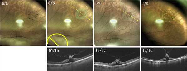 а — малозаметный клапанный разрыв сетчатки с субретинальной жидкостью в верхненаружном сегменте глазного дна; б — обозначение зоны безопасности и зоны предполагаемой лазерной ретинопексии вокруг клапанного разрыва; в — снимок через 5 с после ретинопексии, видны ровные ряды лазерных коагулятов вокруг разрыва; г — снимок через 2 нед после ретинопексии, пигментированные лазерные коагуляты вокруг разрыва. На рис. 1, б—г внизу представлены кросс-секционные сканы ОКТ, положение которых на соответствующих снимках СЛО показано желтыми стрелками.