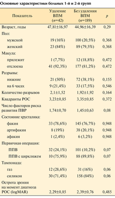 В 2011—2014 гг. в Национальном центре офтальмологии им. акад. Зарифы Алиевой было набрано 227 пациентов (231 глаз): в 42 глазах удалили ВПМ (1-я группа) и в 189 глазах не удаляли ВПМ (2-я группа) при 23-gauge ППВ с или без циркляжа. Миопия высокой степени наблюдалась в 17 (40,5%) глазах в 1-й группе и 81 (42,9%) глазу — во 2-й. Средний период наблюдения составил 14,37±10,76 мес (от 3 до 68 мес). Одномоментная хирургия катаракты на 1-й операции была проведена в 3 глазах в 1-й группе и в 23 глазах во 2-й группе (p=0,431). Силиконовое масло удаляли во всех глазах, в среднем спустя 3,5 мес в 1-й группе (в диапазоне 2—11, IQR=2,5) и спустя 5 мес — во 2-й (в диапазоне 0,5—36,0, IQR=3,88) (U=1,8250, z=2,4, p=0,015, r=0,2).