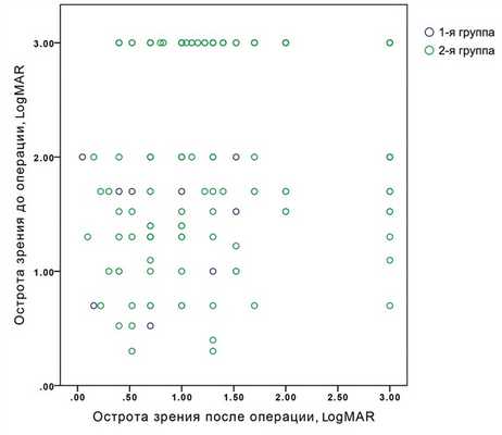 Рис. 3. Предоперационная и послеоперационная острота зрения (LogMAR) в обеих группах.