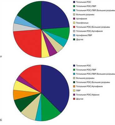 Высокий риск развития ПВР отмечался во всех глазах. Больные (глаза) по факторам риска развития ПВР были подразделены на следующие подгруппы: 3 и более квадранта развития РОС в 176 глазах, большие разрывы в 63 глазах, кровоизлияние в стекловидное тело в 15 глазах, ПВР в 51 глазу, артифакия в 29 глазах, афакия в 10 глазах (рис. 2, а, б). На момент диагноза РОС обе группы не различались показателями возраста, остроты зрения, количеством разрывов, расположением квадрантов РОС и т. д. (см. таблицу).
