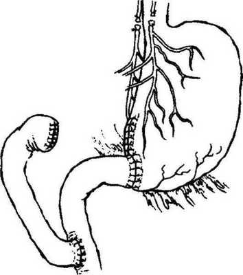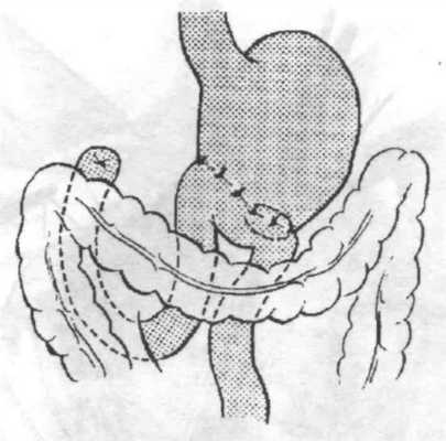 Метод физиологичен, так как создает условия для нормального продвижения пищи, а слизистая оболочка желудка соединяется со слизистой оболочкой двенадцатиперстной кишки, как и в норме. Последнее обстоятельство исключает образование пептических язв соустья. Однако далеко не всегда удается подвести культю желудка к двенадцатиперстной кишке. Натяжение концов при создании анастомоза недопустимо, так как ведет к прорезыванию швов и несостоятельности анастомоза