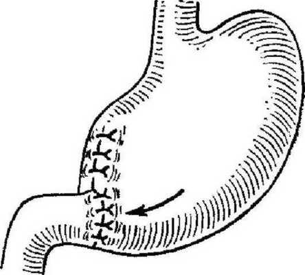 На ограниченном участке освобождают от сращений дистальную часть желудка у большой кривизны так, чтобы её можно было подвести к передней поверхности двенадцатиперстной кишки. После этого передняя поверхность дистальной части желудка у большой кривизны и внутренний край двенадцатиперстной кишки могут быть сближены без натяжения.