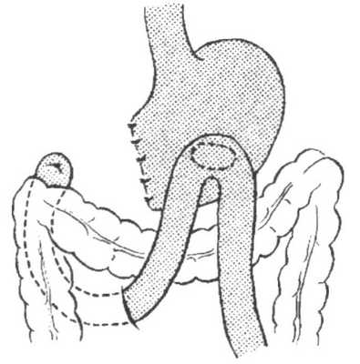 2) благодаря тому что анастомоз накладывается лишь на протяжении нижней трети культи желудка, эвакуация пищи из него происходит не сразу, а непрерывно и постепенно, что нормализует процесс пищеварения. При вшивании всей культи желудка в кишку, как это имеет место при методе Райхель-Полиа, задержка пиши в желудке исключается, т. к. она быстро эвакуируется через широкий анастомоз, и желудочная фаза пищеварения выпадает.