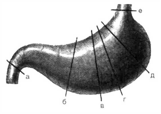 а-б — резекция 1/3 желудка (антрумэктомия), а-в — резекция 1/2 желудка, а-г — дистальная (2/3) резекция желудка, а-д — субтотальная резекция, а-е — тотальная гастрэктомия, г-е — проксимальная резекция. (Из: Шабанов В.А., Кушхабиев В.И., Вели-Заде Б.И. Оперативная хирургия: Атлас. — М., 1977.)