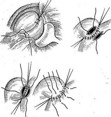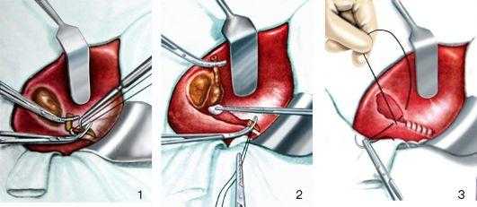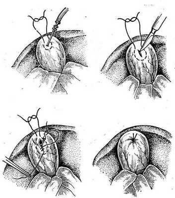 После удаления всего содержимого из пузыря в него вводят катетер Фолея, который укрепляют, затягивая кисетный шов. Второй кисетный шов накладывают, отступив от первого, и, погружая стенку пузыря внутрь, затягивают его над катетером. Дренажную трубку выводят наружу. Дно пузыря подшивают к брюшине вокруг трубки.