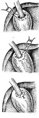 Если дно желчного пузыря удается вывести в рану, его стенку фиксируют двумя прошивными нитями-держалками и вскрывают. Иглу извлекают.