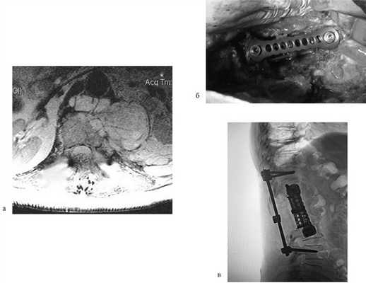 Рис. 3. МРТ-картина до хирургического лечения (а). Тело позвонка LII с признаками деструкции, структура его представлена опухолевой массой размером 87×57×67 мм. Интраоперационная фотография (б), боковой доступ. Установленный телескопический эндопротез тел позвонков LI—II c боковой фиксирующей пластиной. Послеоперационная рентгенограмма поясничного отдела позвоночника (в). Металлоконструкция установлена корректно. Исследование выполнено на 1-е сутки после хирургического лечения.