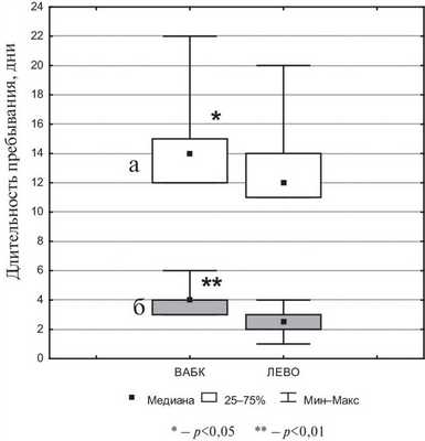 Длительность пребывания в палате реанимации и в стационаре (см. рисунок) Рисунок 1. Длительность пребывания больных в стационаре (а) и в реанимационной палате (б). в группе ВАБК был достоверно больше, чем в группе ЛЕВО (p