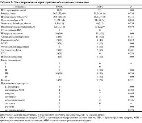 В послеоперационном периоде анализировали длительность искусственной вентиляции легких (ИВЛ), пребывание больного в палате реанимации, длительность пребывания больного в стационаре после операции, летальность, потребность в инотропной поддержке, осложнения: ВАБК-ассоциированные осложнения, фибрилляция предсердий (ФП), диализзависимая почечная недостаточность, острый инфаркт миокарда, инсульт, медиастинит. Продолжительность ИВЛ была определена как промежуток времени с момента поступления пациента в палату интенсивной терапии до экстубации. Осложнения, связанные с проведением ВАБК, включали ишемию конечности, потребовавшую удаления баллона, кровотечение из места установки баллона, потребовавшее проведения операции гемостаза, нагноение места установки баллона. Инотропную поддержку определяли как потребность в одном из инотропных препаратов (допамин, адреналин) в дозе, эквивалентной допамину (>5 мкг/кг/мин) или их комбинации в течение не менее 6 ч после операции.