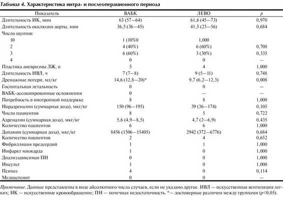 Характер хирургического вмешательства, длительность ИК и окклюзии аорты между группами достоверно не различались. Длительность послеоперационной ИВЛ была сопоставима в обеих группах. Суммарный объем дренажных потерь в группе ВАБК был достоверно больше, чем в группе ЛЕВО (р<0,01).