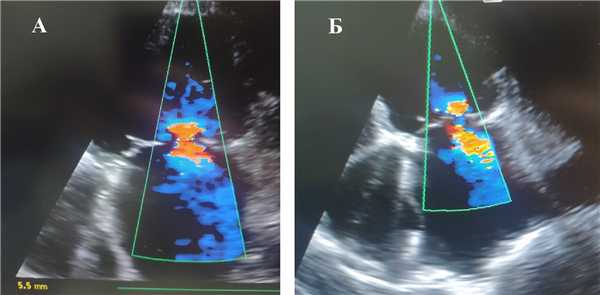 Рис. 1. Визуализация митральной недостаточности с помощью цветного допплеровского картирования до оперативного вмешательства: А — до установки внутриаортальной баллонной контрпульсации, Б — на фоне работающей внутриаортальной баллонной контрпульсации в раннем послеоперационном периоде