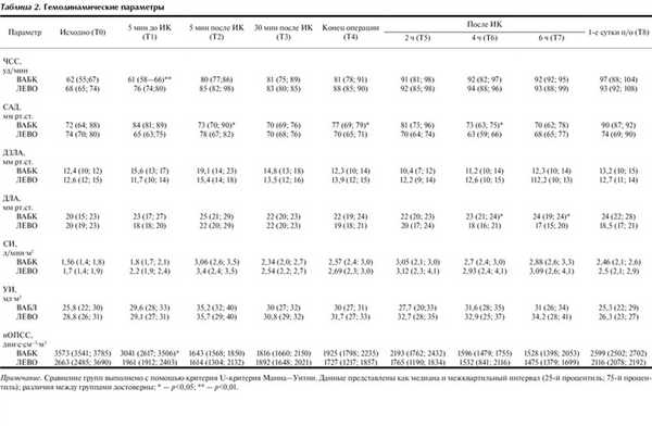 Изучение параметров гемодинамики было основано на методике термодилюции с использованием катетера Свана—Ганса 7Fr («B. Braun», США). Параметры центральной гемодинамики (среднее артериальное давление — САД, частота сердечных сокращений — ЧСС, сердечный индекс — СИ, ударный индекс — УИ, центральное венозное давление — ЦВД, давление легочной артерии — ДЛА, давление заклинивания легочных капилляров — ДЗЛК, индекс общего периферического сопротивления — иОПСС) фиксировали на следующих этапах: 1 — после вводной анестезии (T0); 2 — перед началом ИК (T1); 3 — на 5-й минуте после ИК (T2); 4 — через 30 мин после ИК (T3); 5 — в конце операции (T4); 6 — через 2 ч после ИК (T5); 7 — через 4 ч после ИК (T6); 8 — через 6 ч после ИК (T7); 9 — в 1-е сутки после операции (T8).