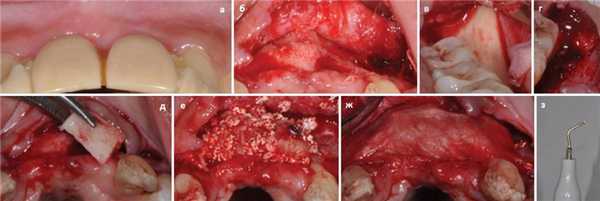Фото 3 (а) Дефект альвеолярного гребня; (б) Сепарация лоскута; (в) Обнажение ветви нижней челюсти; (г) Забор аутогенного трансплантата; (д) Костный блок; (е) Адаптация аллотрансплантата вокруг аутотрансплантата; (ж) Коллагеновая мембрана; (з) Пьезотом с наконечником.