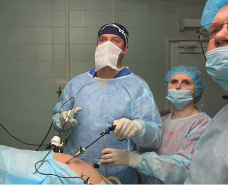 Хирургическое вмешательство начинается с инсуффляции в брюшную полость углекислого газа с помощью иглы Вереша (Veress), введенной в околопупочную область. Затем устанавливается первый десятимиллиметровый троакар, предназначенный для введения лапароскопа с видеокамерой.