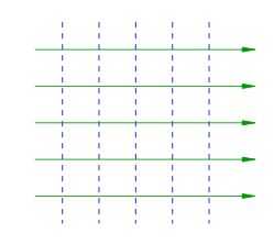 Синим пунктиром показаны параллельные плоскости, являющиеся волновыми поверхностями. Лучи - зелёные стрелки - снова оказываются прямыми линиями.