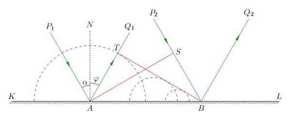 Из точек И выходят отражённые лучи и . Перпендикулярная этим лучам плоскость есть волновая поверхность отражённой волны. Угол отражения обозначим пока ; мы хотим доказать, что .