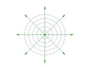 Волновые поверхности показаны синим пунктиром, а зелёные радиальные стрелки - это лучи, перпендикулярные волновым поверхностям.