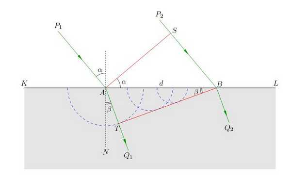 принципа Гюйгенса: всё дело в том, что скорость вторичных волн в среде меньше скорости света в воздухе, и это приводит к повороту волновой поверхности относительно исходного положения .