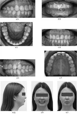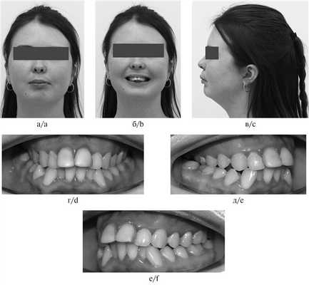 а—в — дистальная окклюзия зубных рядов до лечения; г—е — фото пациентки фас, улыбка, профиль).