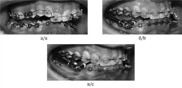 Лечение по алгоритму 2: а — фиксация брекет-системы, б — фиксация ФНТА, в — установка минивинтов.