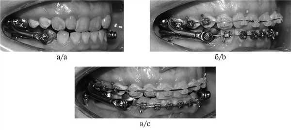Лечение по алгоритму 1: а — фиксация ФНТА, б — фиксация брекет-системы, в — установка минивинтов.