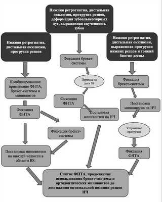 Рис. 1. Схема алгоритмов комбинированного применения ФНТА, брекет-системы и ортодонтических минивинтов.