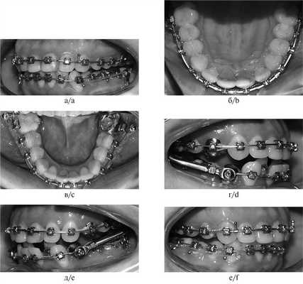 Эластическая цепочка была установлена от минивинтов к брекетам клыков или первых премоляров нижней челюсти с каждой стороны. Замену эластических цепочек осуществляли каждые 3 нед.