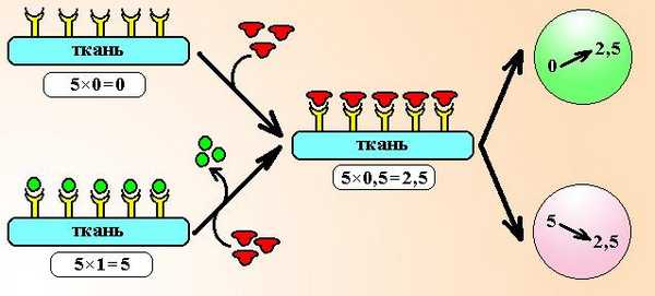 Схема 2. Действие парциальных агонистов. Предположим, что имеется тест-ткань, несущая всего 5 рецепторов. Если рецепторы свободны, ответ ткани равен нулю. После добавления парциального агониста с внутренней активностью 0,5 он будет активировать рецепторы и общий ответ ткани составит 5´0,5=2,5 ЕД. Если рецепторы уже заняты полным агонистом, ответ ткани максимальный (5´1,0=5 ЕД), при добавлении к системе парциального агониста он начинает вытеснять лиганд из связи с рецептором и будет активировать их слабее полного агониста. Общий ответ ткани при этом уменьшится и составит 5´0,5=2,5 ЕД, т.е. возникнет эффект блокады.