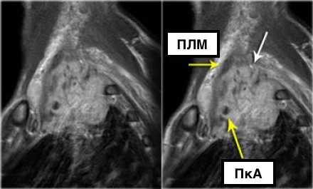 Заметна инвазия в плечевое сплетение (белая стрелка) и инвазия в подключичную артерию (а).