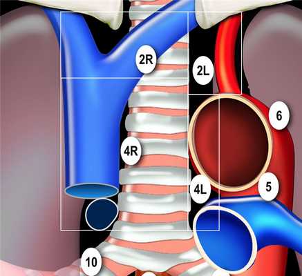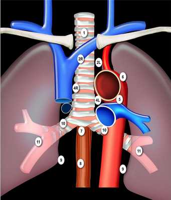 - 2L Левые верхние паратрахеальные располагаются вдоль левой стенки трахеи, от верхнего края рукоятки грудины до верхнего края дуги аорты.