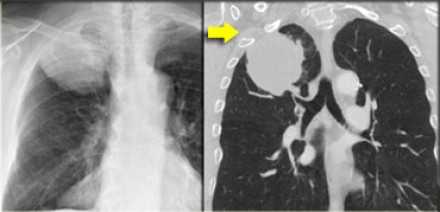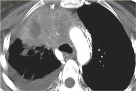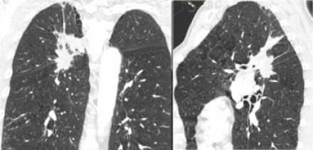 - с ателектазом или обструктивным пневмонитом, который располагается в прикорневых отделах, вовлекает часть легкого или все легкое