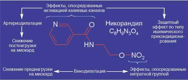 Никорандил состоит из нитратной группы и остатка амида никотиновой кислоты, поэтому обладает свойствами органических нитратов и активаторов калиевых каналов и сбалансированно снижает пред- и постнагрузку на миокард (см. рисунок).