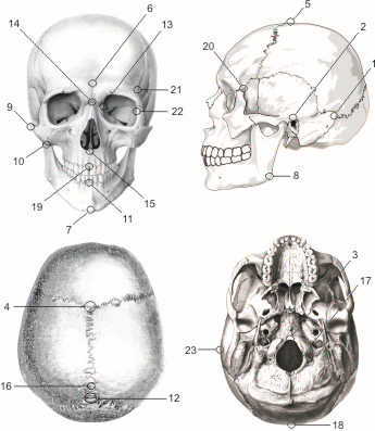 Были проведены краниометрические исследования 16 черепов взрослого человека с использованием толстотного и скользящего циркулей, штангового циркуля и миллиметровой ленты. Учтены общепринятые рекомендации по использованию в этих целях краниометрических параметров [1, 2, 3]. Выбраны, найдены и использованы 23 общепринятые краниометрические точки (табл. 1, рис. 1).