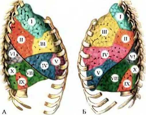 Границы сегментов на поверхности лёгких (снаружи). А — правое лёгкое; Б — левое лёгкое.