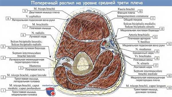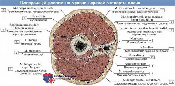 По сторонам от нее вглубь отходят две фиброзные межмышечные перегородки, septa intermuscularia brachii, отделяющие передние мышцы от задних. Медиальная перегородка, septum intermusculare brachii mediale, идет между m. brachialis и трехглавой мышцей и прирастает к костному гребешку над epicondylus medialis плеча.