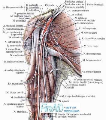 Клетчатка верхнего отдела подмышечной ямки содержит основной сосудисто-нервный пучок - подмышечные сосуды и сначала пучки, а затем ветви плечевого сплетения.